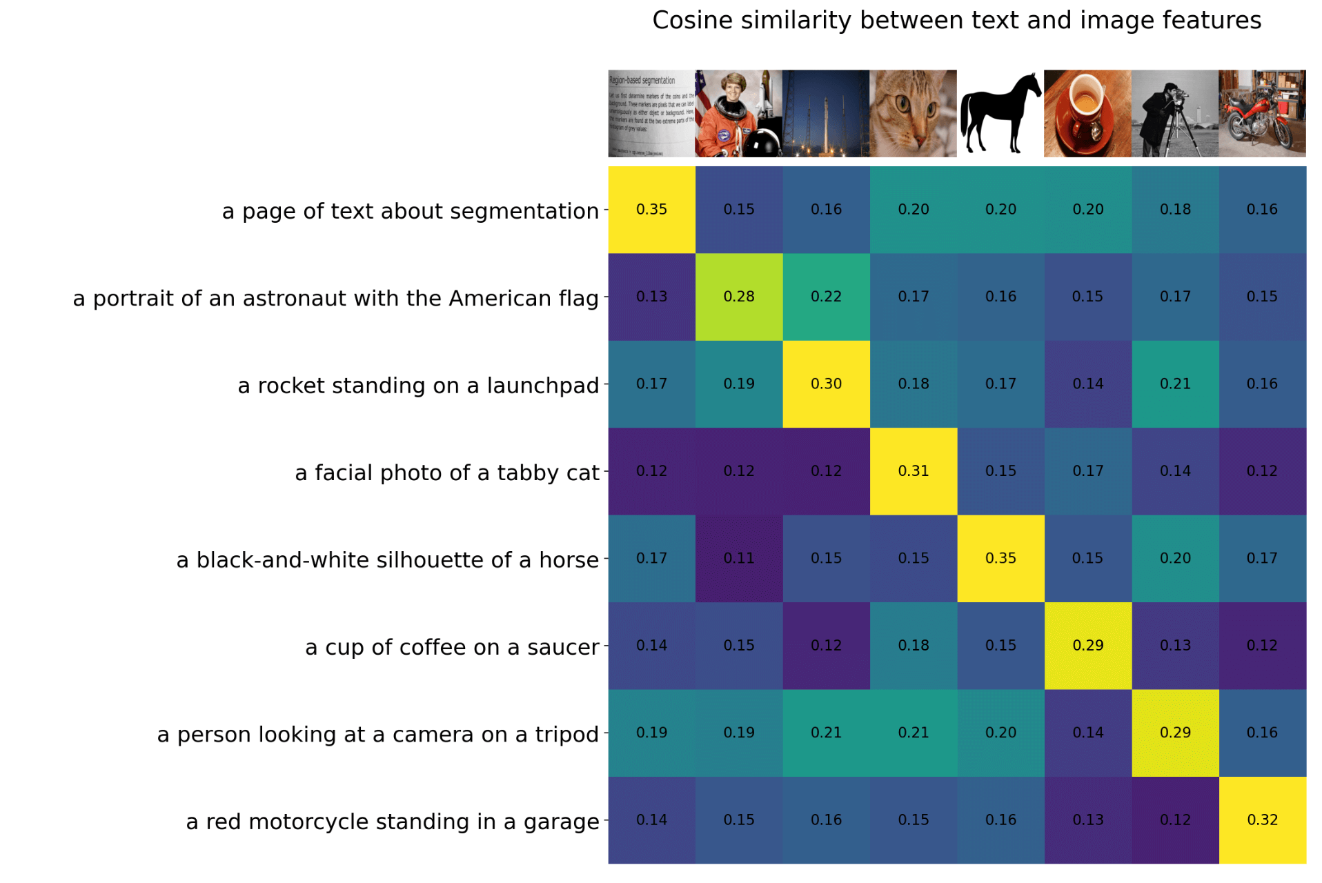 OpenAI used 400 million sets of image-text pairs to train this model. The final trained CLIP model effect is shown in the diagram below. When we input a description of an image, CLIP can determine which picture is closest to this description. For example, in the fourth row of the diagram below, the description is "a facial photo of a tabby cat" and it's most related to the fourth image vertically, with a similarity of 0.31, and only 0.12 for the first screenshot of the book.